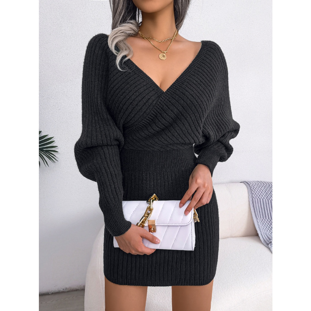 2025 Autumn-Winter Sexy Cross V-neck Bat Skirt With Hip Wrapping, Hairy Dress
