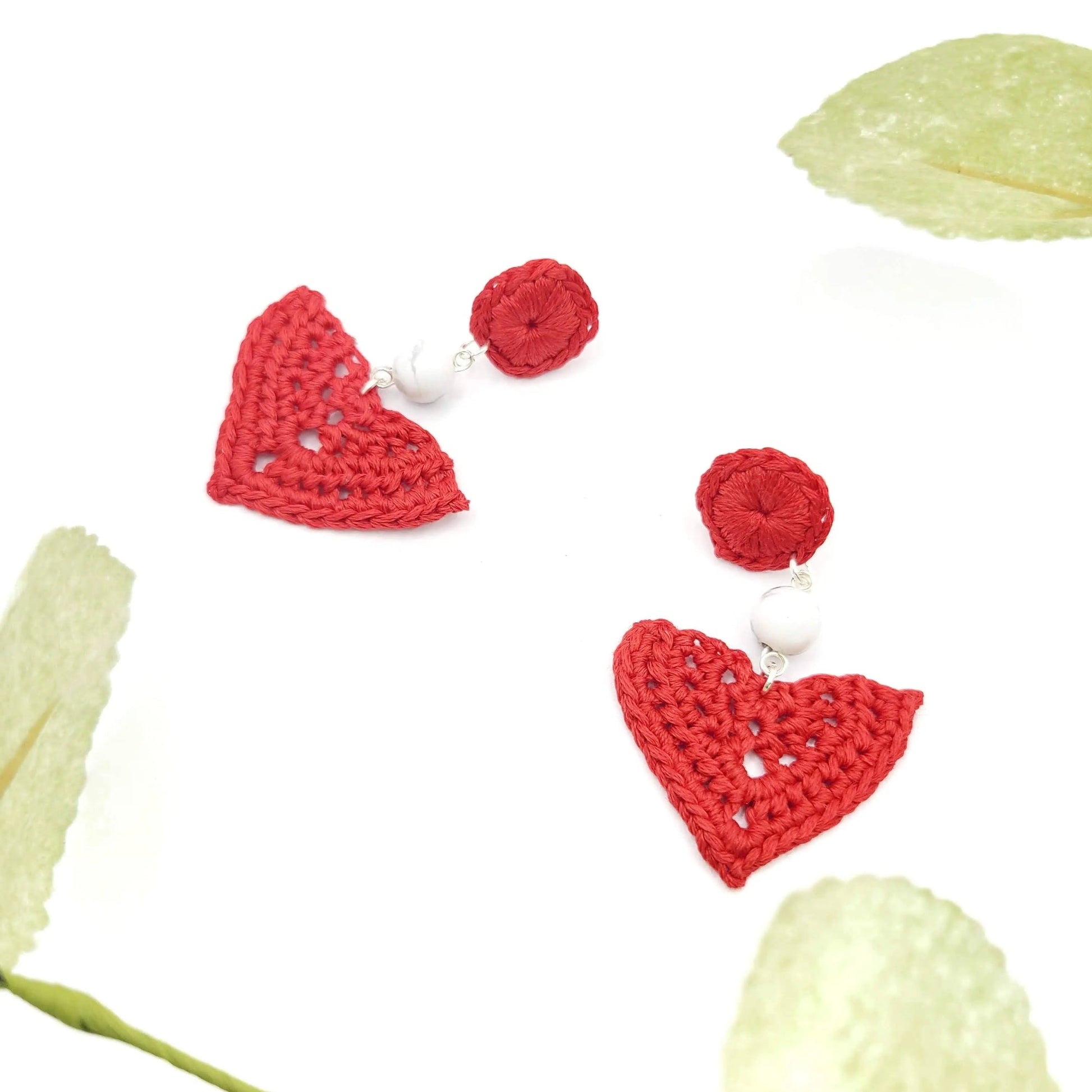 A stunning handmade design is just what you need and this pair of creative earrings delivers! The white howlite crystal dangles in this design as it is connected to a handmade triangle. Head out to your event with this handmade creation and enjoy yourself! This design is very light weight because it was created with 100% cotton threads and stiffened to hold it's shape for you. Quality backings are used made with surgical steel so don't worry about the post backing damaging your ear.